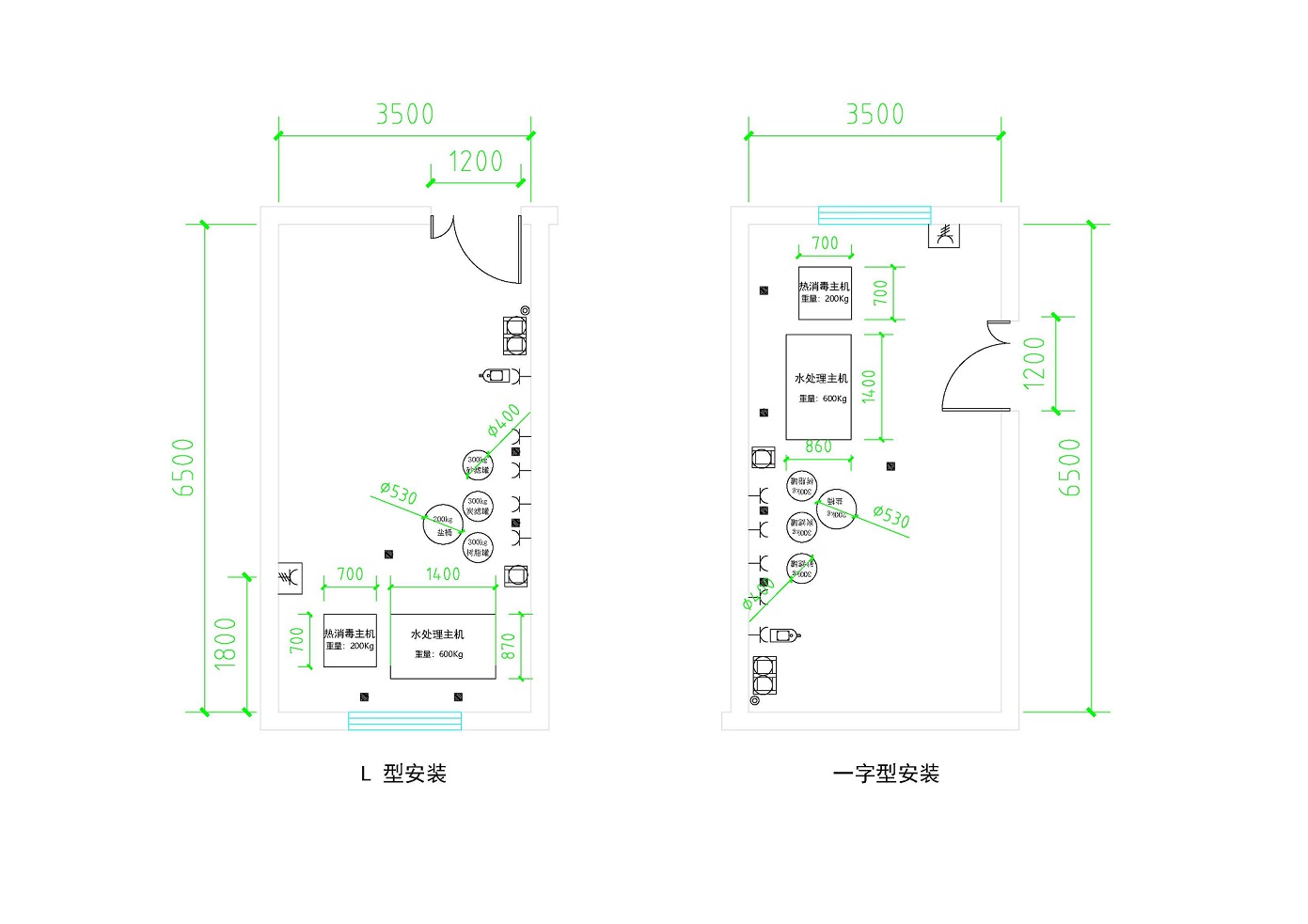 1:水處理間的安裝面積≥ 18 平方米;房間最小寬度≥2.5米;