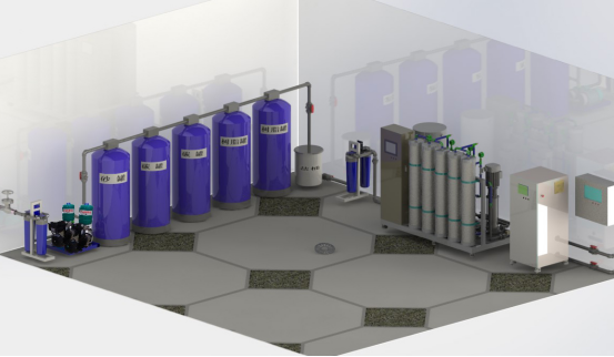 全套水處理系統(tǒng)的水路循環(huán)為:水源→前置過(guò)濾器→前級(jí)增壓泵→多介質(zhì)砂罐→軟化器→活性炭罐→保安過(guò)濾器→水箱→一級(jí)反滲系統(tǒng)→二級(jí)反滲系統(tǒng)→管道熱消毒系統(tǒng)→透析機(jī)→水箱。